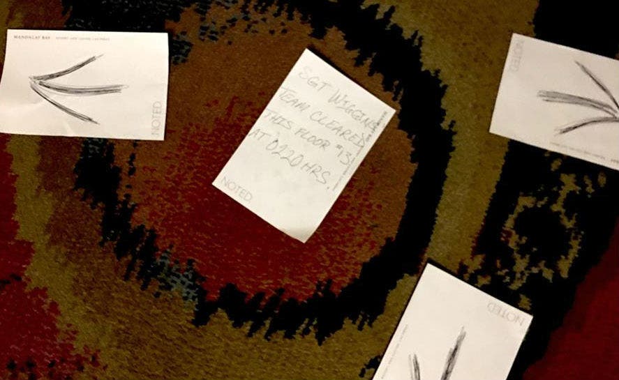Guests at the Mandalay Bay were allowed to leave their rooms shortly after 7:30 a.m. on Monday, Traynor said. He went down to the casino floor soon after. On his way downstairs he noticed a message from the SWAT team noting that his floor had been cleared and secured.