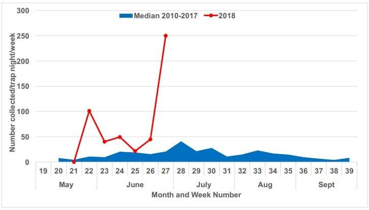 The district has reported 48 samples of mosquitoes with West Nile virus had already been found in traps located in Evanston, Glencoe, Glenview, Lincolnwood, Morton Grove, Niles, Northbrook, Northfield, Skokie and Winnetka among 757 batches tested as of July 11.
