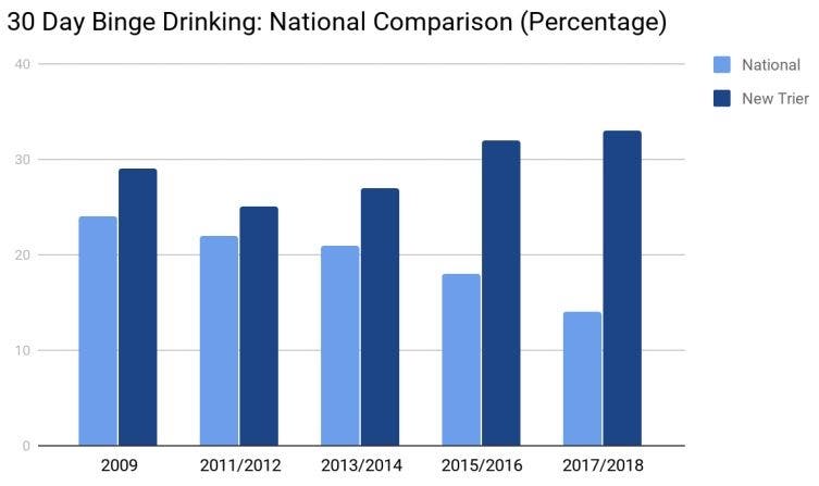 When broken down by grade cohorts at New Tier, 13 percent of ninth graders, 26 percent of 10th graders, 42 percent of 11th graders and 54 percent of 12th graders reported binge drinking within the month leading up to the survey. Binge drinking is defined as consuming five or more drinks for males or four or more drinks for females within a couple of hours.