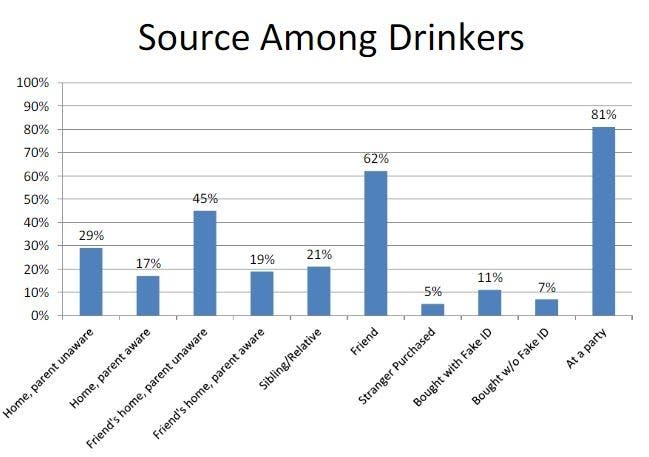 Survey data show parties and friends are the most common source of alcohol. Fewer than 20 percent of respondents reported acquiring alcohol at home or a friend's house with their parents' knowledge. However, students said getting alcohol from complicit parents was still more common than having a stranger purchase it or buying it themselves — with or without a fake ID.