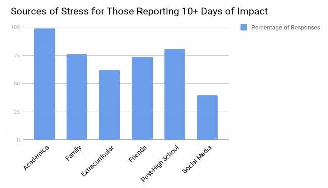 Academics and post-high school plans were the most common sources of stress. One in five New Trier students said stress impacted their ability to deal with daily activities for 10 or more days in the past month. Nearly all of those students cited academic pressures. For the first time, the survey asked students how social media contributed to their levels of stress.