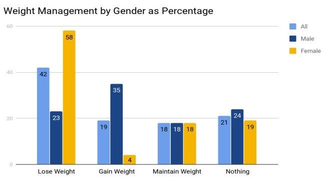 Administrators were also concerned about the number of students who reported using unhealthy weight loss strategies. Of the 42 percent of students who said they were trying to lose weight, 24 percent said they had skipped meals, 5 percent reported purging or using laxatives and 4 percent said they had taken diet pills.