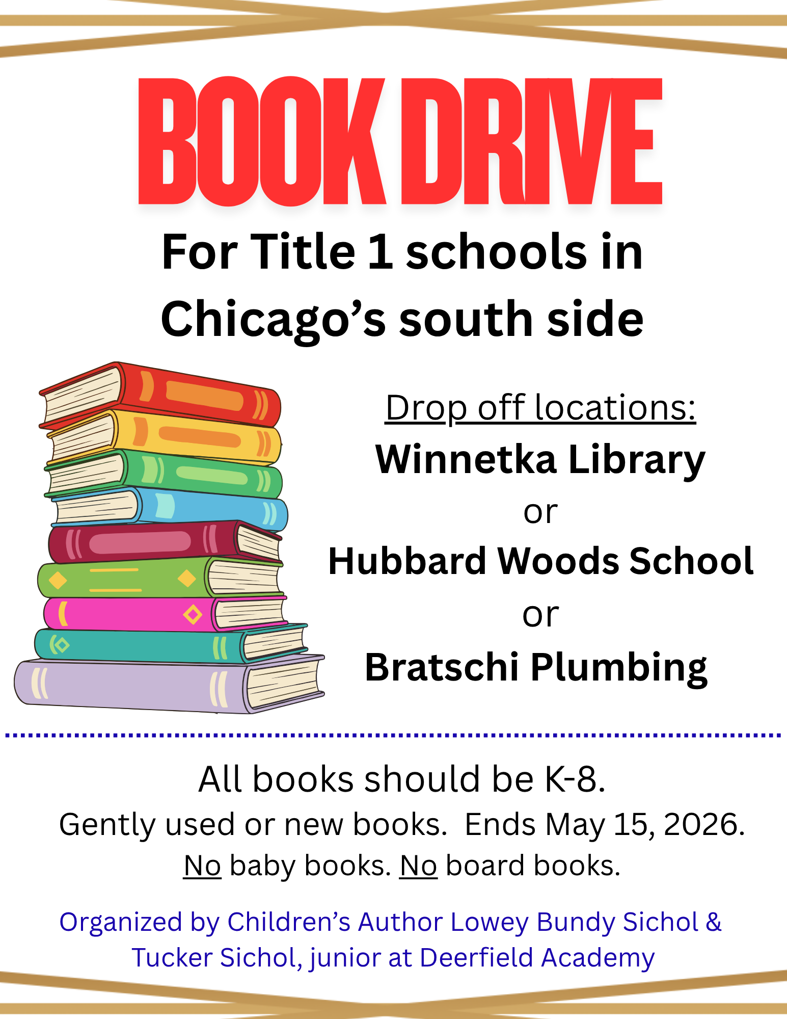 WINNETKA, IL — A mother-son duo from Winnetka is running a book drive to support Title 1 schools in Chicago that lack funding for books in their libraries.