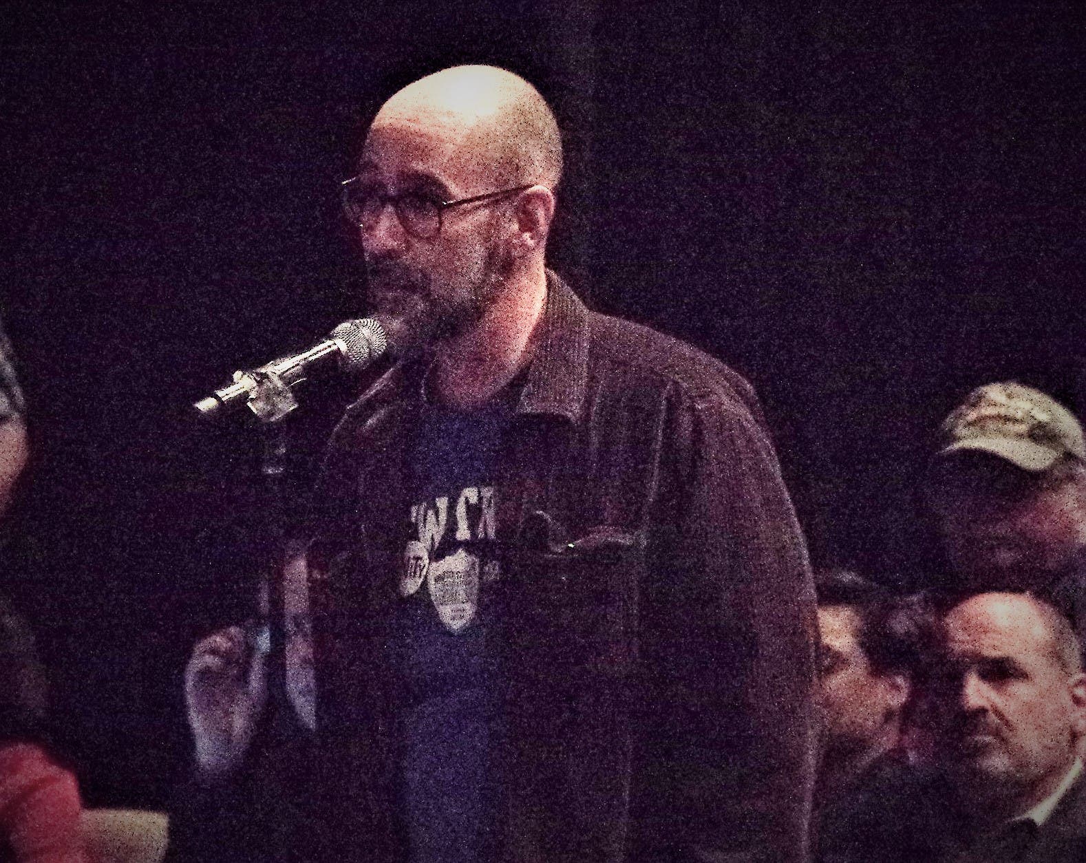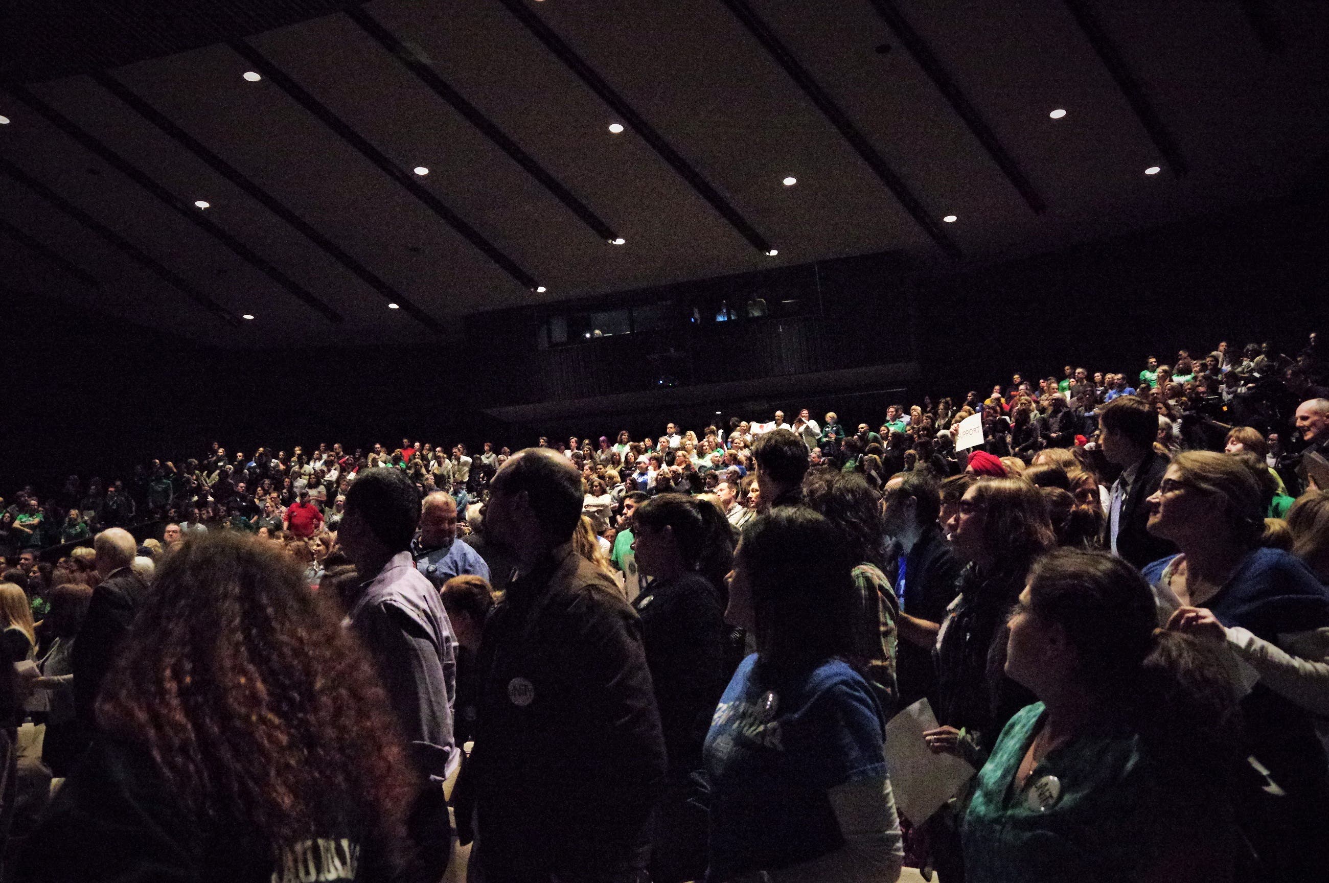 7:19 p.m. The room is completely packed, with dozens in pre-made green t-shirts in support of the day.