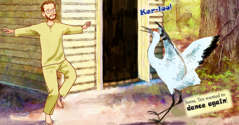 Dancing With Tex describes the real friendship between George Archibald, co-founder of The International Crane Foundation, and Tex, a rare Whooping Crane who believed she belonged with people. At the time, the Whooping Cranes were on the verge of extinction. Every egg mattered. To help Tex lay a fertile egg could save the species. But it would take unusual measures. George would need to be accepted as her dancing partner because all cranes dance before laying an egg, and Tex only related to people. It took six years along with special shots, but George’s efforts resulted in Tex’s chick, which made an impact in saving the Whooping Cranes. That success even led to an appearance for George on the Johnny Carson show.