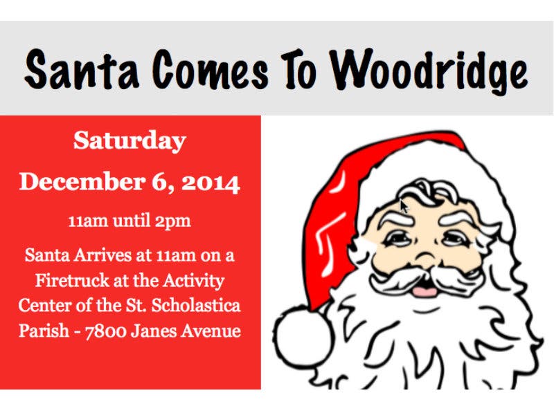 Santa comes to Woodridge on Saturday, Dec. 6, from 11 a.m. to 2 p.m. at St. Scholastica (7800 Janes Avenue in Woodridge).