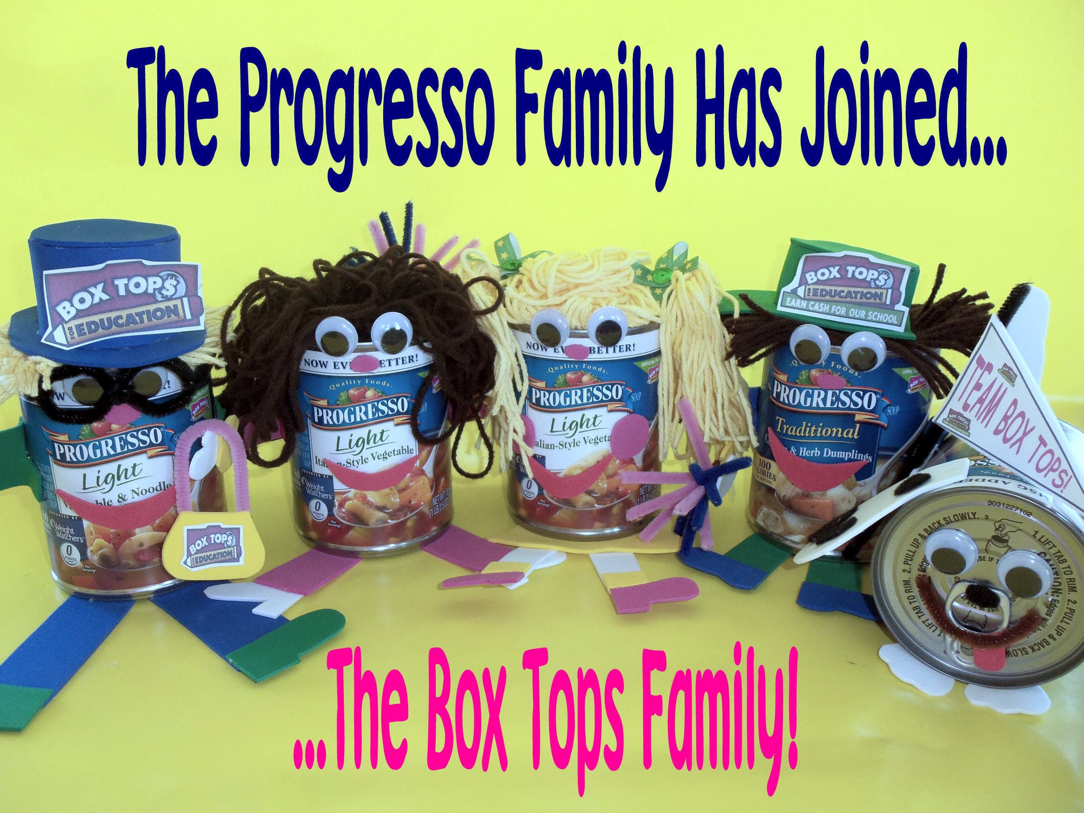 Page entered her photograph announcing "The Progresso Family Has Joined… The Box Tops Family" in a promotional contest. Her sons, ages 8 and 6, suggested she add a Progresso soup can decorated like a dog to the "family" of decorated soup cans she used to illustrate her slogan.