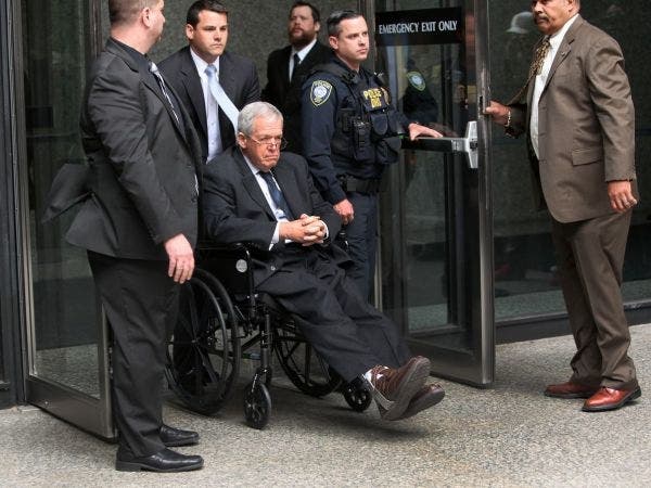 Photo: Former House Speaker Dennis Hastert leaves the Dirksen Federal Court House in a wheelchair after his sentencing on April 27, 2016 in Chicago, Illinois. Credit: Joshua Lott/Getty Images News/Getty Images