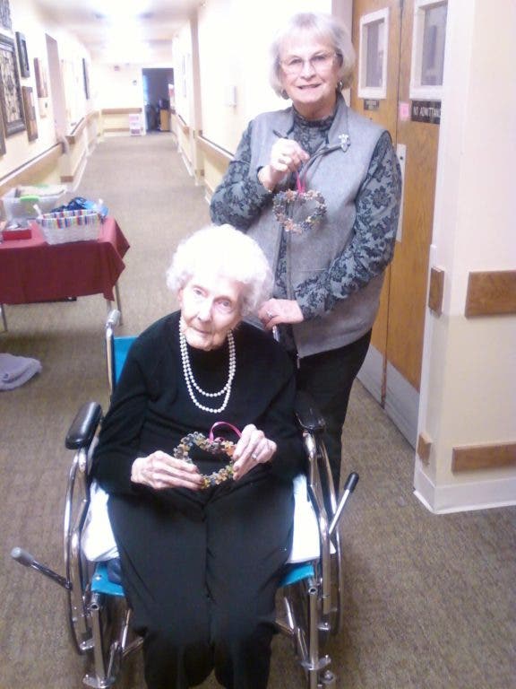 Hillside resident, Ruth Henderson, poses with one of the hearts that Kendall County Association for Home and Community Education (HCE) made and gave to everyone at in Yorkville.