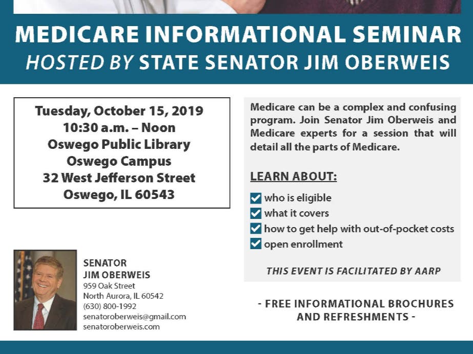On Oct. 15, Oberweis will host a Medicare Informational Seminar 10:30 a.m. to noon at Oswego Public Library, 32 W. Jefferson St. in Oswego.