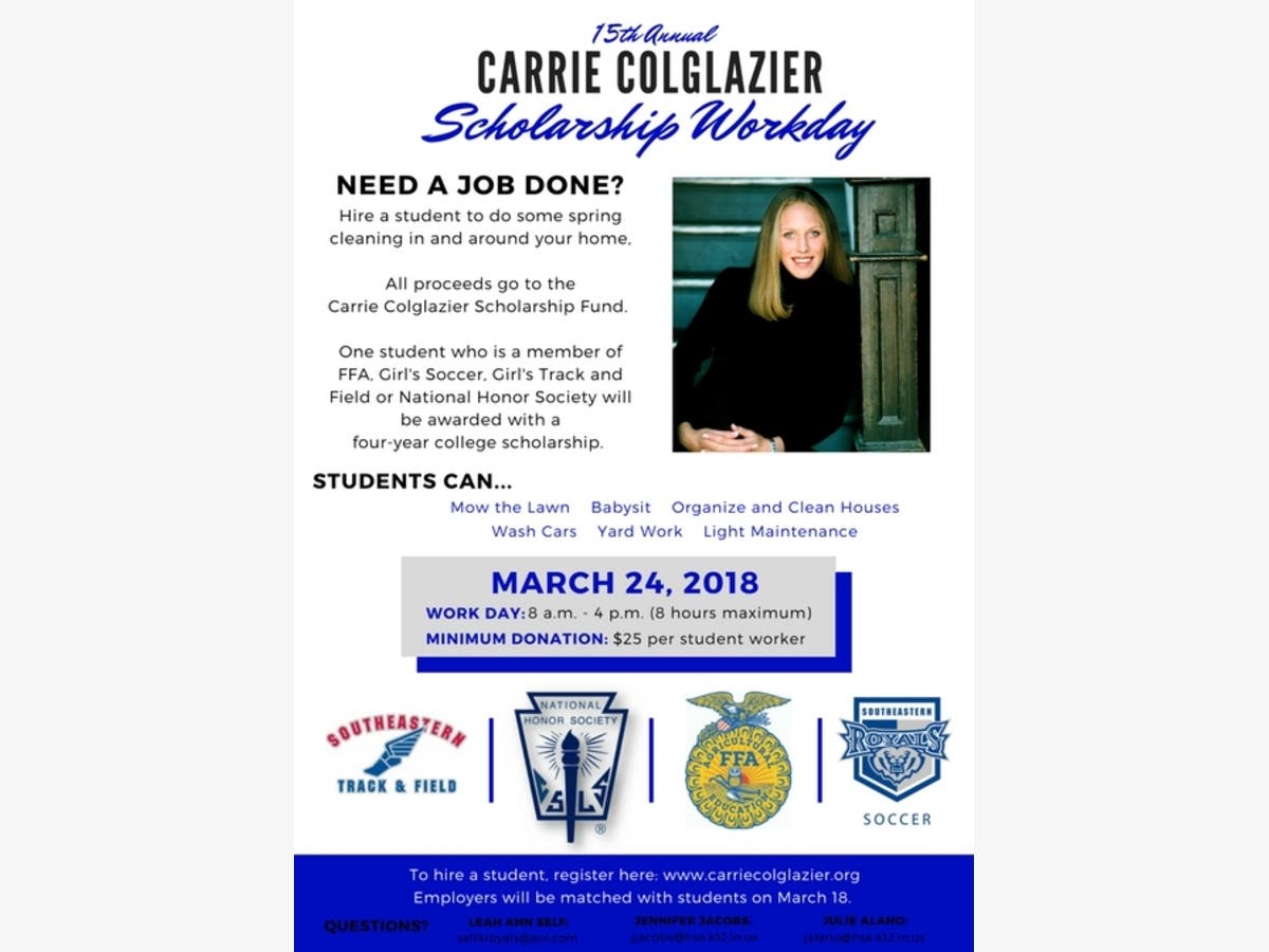 FISHERS, IN -- Need some spring cleaning done around your home? A babysitter? Car wash? You're in luck, thanks to the upcoming 15th Annual Carrie Colglazier Scholarship Workday. The event, taking place March 24 from 8 a.m. to 4 p.m., is being held in honor of Carrie Colglazier, a 2002 Hamilton Southeastern graduate who was tragically killed by a drunk driver in the summer of 2003. Colglazier was heavily involved in the FFA program at HSE and was a two sport All-State athlete in soccer and track, extremely passionate about her family, friends, teachers, teammates, coaches and being a Royal, according to the event's committee.