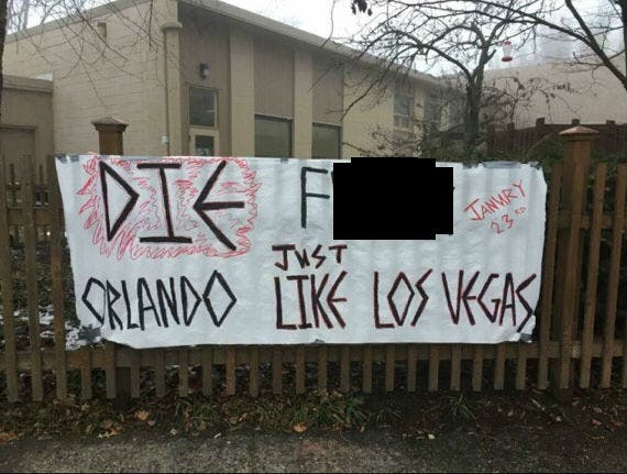 The second hateful banner said "Die f---er just like Los (sic) Vegas," and the word "Orlando." These are most likely references to the brutal massacres in Las Vegas in October 2017 and Orlando in June 2016.