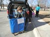 Jacob Wiebke helped push a wheel cart stacked with so many sacks and tubs of donated clothing that it wouldn't fit through narrow entrance on Monday.