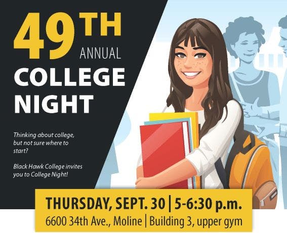Black Hawk College will host the 49th Annual College Night from 5-6:30 p.m. Thursday, Sept. 30 at the Quad-Cities Campus in the gym in Building 3.