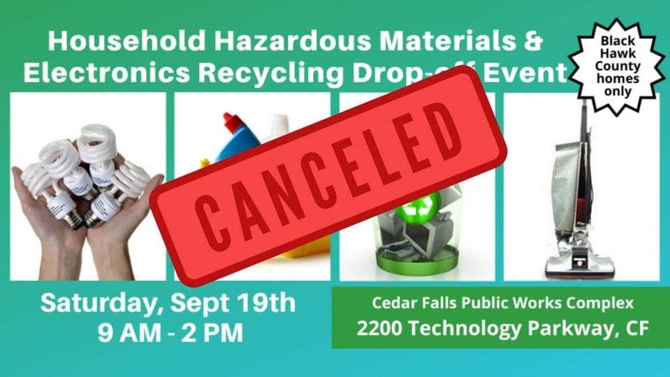 Due to COVID-19 precautions and logistical issues, the Black Hawk County Solid Waste Management Commission and the City of Cedar Falls have canceled the September 19, 2020, Household Hazardous Materials and Electronics Recycling Collection Event. The next collection event is anticipated to be held in the spring of 2021; the date and location has not been confirmed at this time.