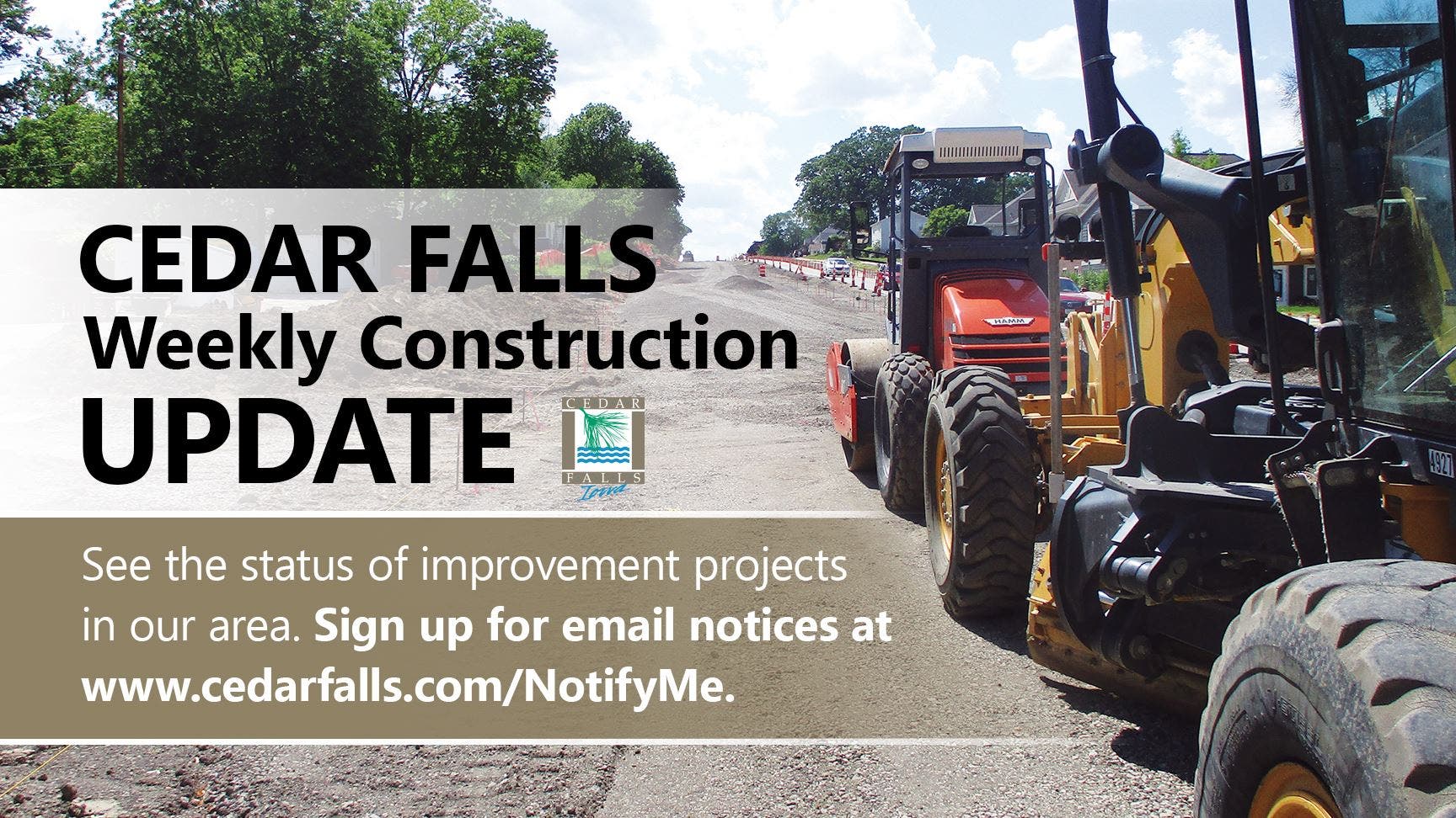 Stay updated on ongoing street construction projects! Scroll down to receive the latest news and learn what you can expect in the coming week. You can also sign up to receive construction updates (including weekly notices) straight to your email by visiting www.cedarfalls.com/notify and selecting the appropriate project.