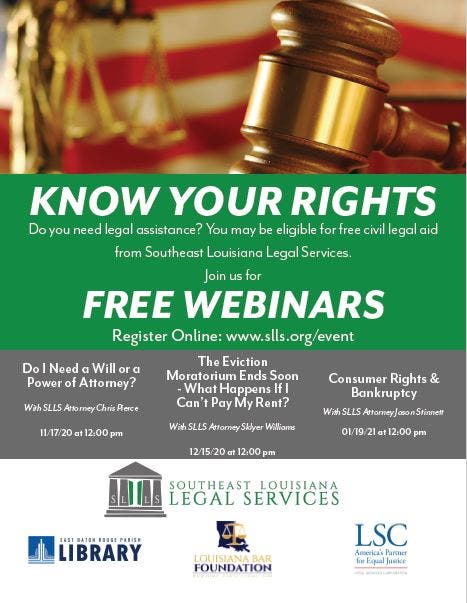 If you have questions about wills, tenants’ rights, or bankruptcy, these upcoming webinars from Southeast Louisiana Legal Services may be just what you need.