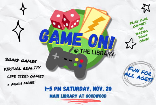Celebrate International Games Day by getting your game on at the library from 1-5 p.m. Saturday, November 20 at the Main Library at Goodwood! Bring the whole family to this all-ages, free event and see how many different games you can play in one day! Go from card games to life-sized games, enjoy a board game before switching to the VR headset, connect with local gaming groups and stores like Little Wars and more… come to the library for some fun and friendly competition!