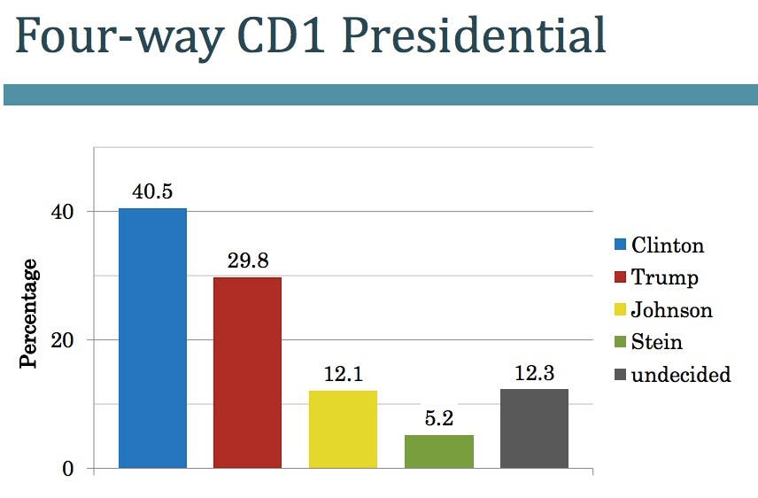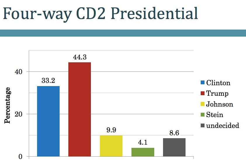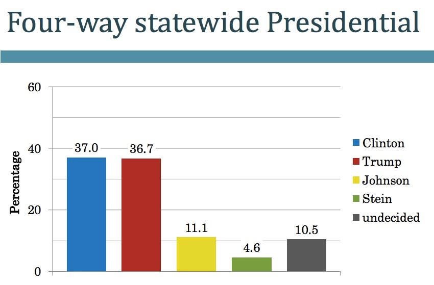 AUGUSTA, ME — The 2016 presidential race in Maine is a dead heat. Hillary Clinton and Donald Trump were tied at 37 points while Libertarian Gary Johnson registered 11 points, according to the Maine People's Resource Center's latest public opinion poll. The poll was conducted Sept. 15-17 and recorded results from 835 likely Maine voters via phone and internet communication.