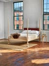 The frame for the High Mast Bed is a modern interpretation of a classic four poster bed. It is an original Chilton design with clean lines and turned legs shaped to resemble the front legs of the Alfred Village rocking chair, an authentic Shaker chair currently sold only at Chilton and the Sabbathday Lake Shaker Village.
