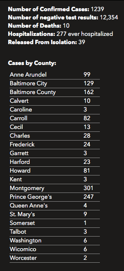 Maryland now has 1,239 confirmed cases of the virus, according to data released Sunday morning. Nearly 250 people tested positive for the new coronavirus in Maryland since the previous day.