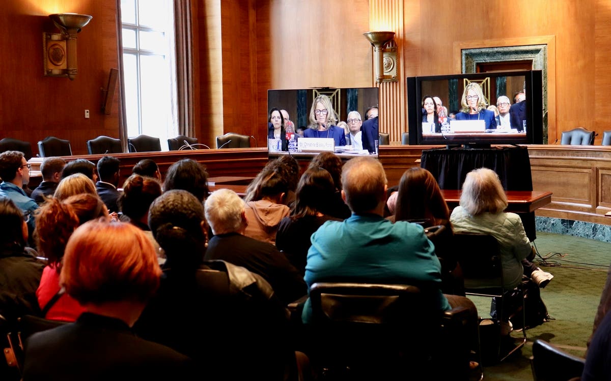 PHOTO: Members of the public sat silently watching television Thursday in an overflow room near the Senate Judiciary Committee hearing where Christine Blasey Ford detailed her sexual assault charges against Supreme Court nominee Brett Kavanaugh. (Albane Guichard/Capital News Service)