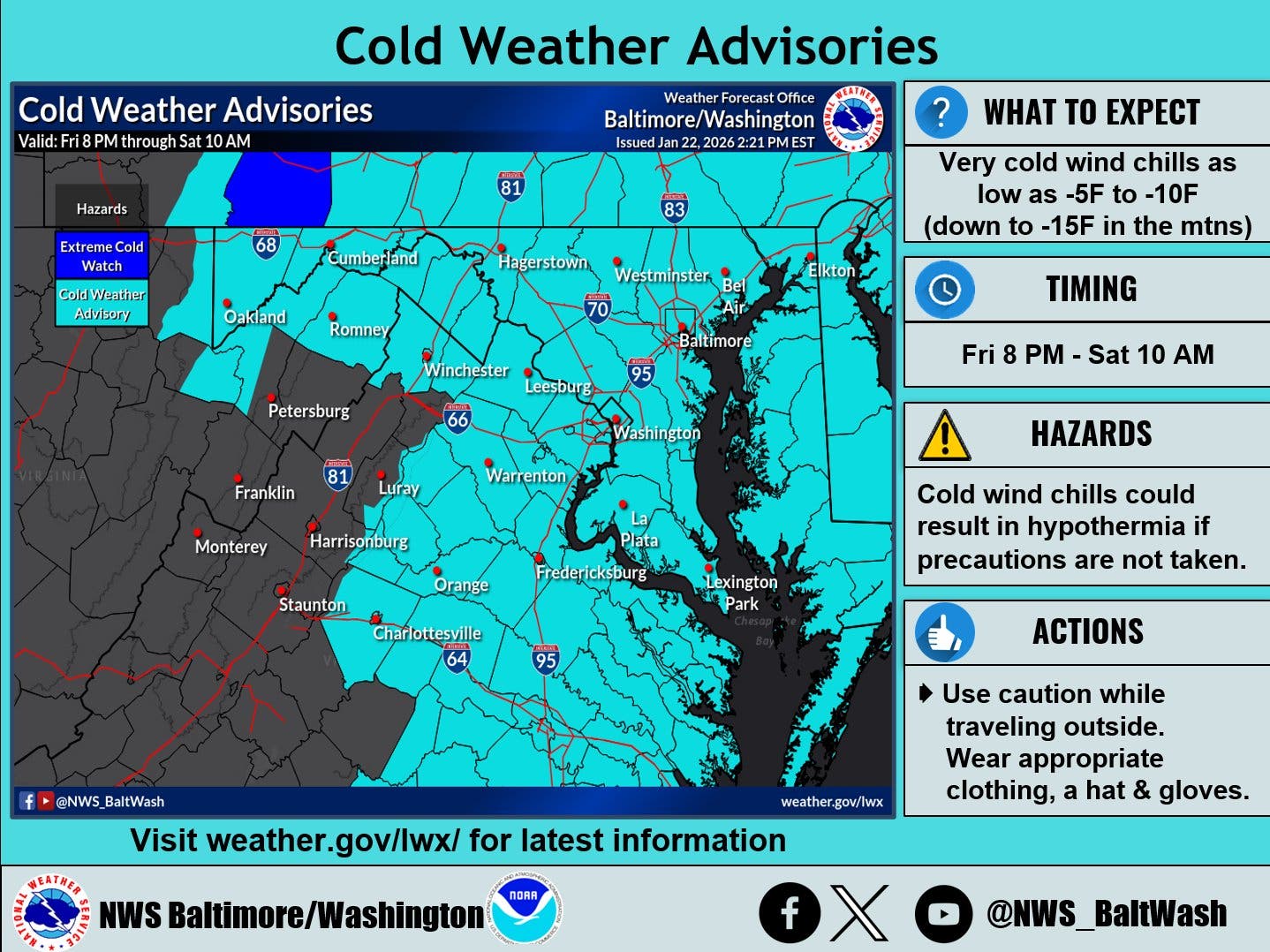 Areas included in the cold weather advisories are the District of Columbia, the city of Baltimore, and the counties of Cecil, Baltimore, Prince George's, Anne Arundel, Montgomery, Howard, and Harford. The advisory will be in effect from 8 p.m. Friday to 10 a.m. Saturday.