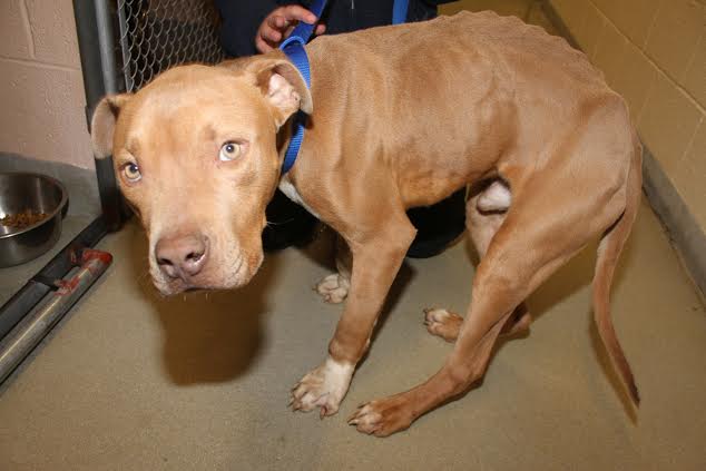 »This malnourished pit bull was one of of dogs found abandoned and chained to posts without food or water. Courtesy of the Anne Arundel County Police Department