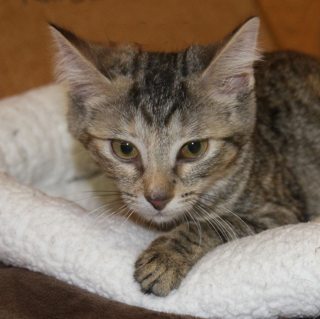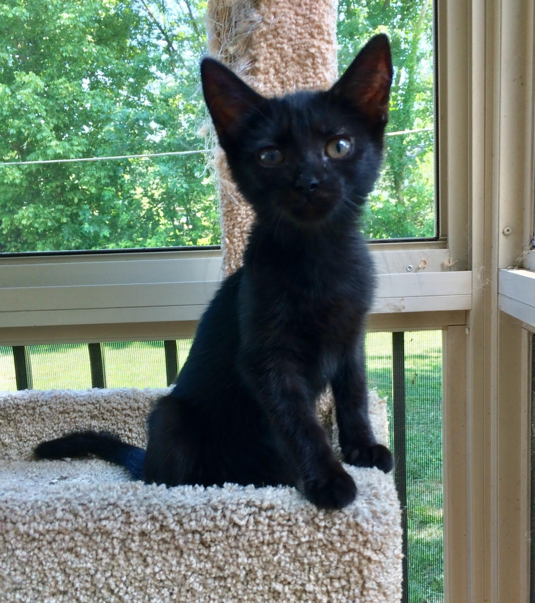 Personality: I’m very sweet and love to cuddle. I also have bursts of energy and love to play with toys and my littermates. I love to climb the cat tree on my foster mom’s screened porch to watch the birds. When I’m not busy climbing and playing with my kitten friends, I love curling up on my foster mom’s lap, being petted and taking a nap.