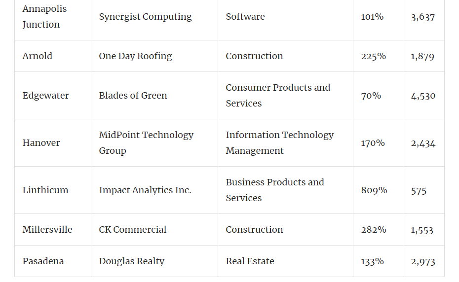 Altogether, 149 Maryland enterprises made the list. Baltimore's Hunt A Killer scored the No. 6 spot in the nation and the highest slot in the state. The company posted a 20,485 percent growth rate through its sales of murder mystery board games.
