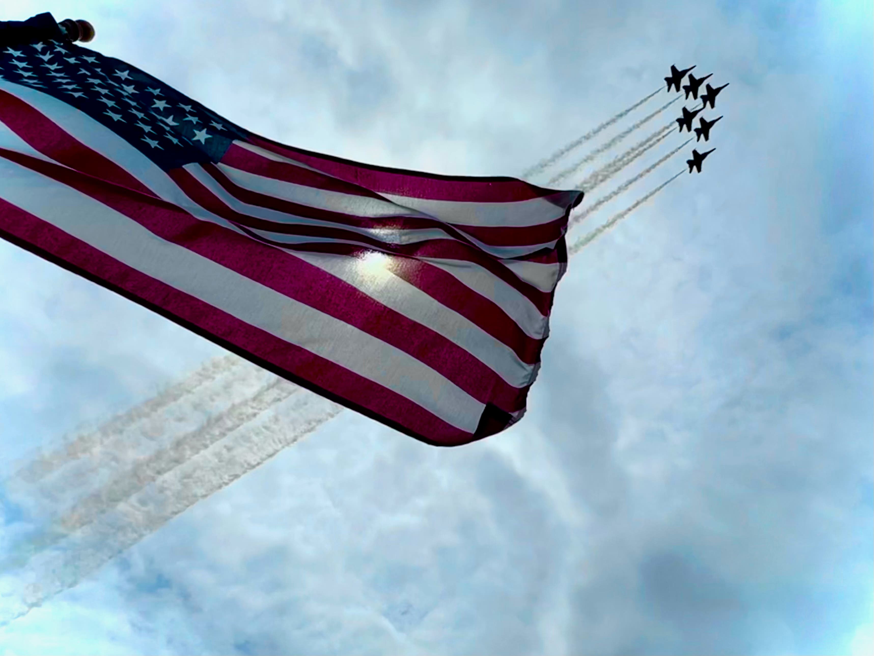 Alaina Alter shared this photo of the Blue Angels soaring above an American flag.