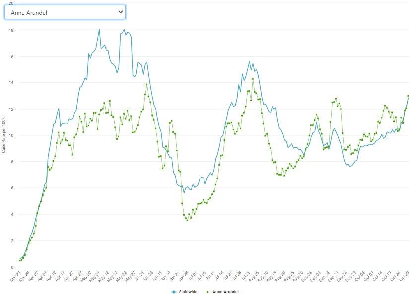 The county must average less than 28.96 new coronavirus infections-per-day over a rolling week to meet the state's per-capita suggestion. Anne Arundel County has averaged 78.14 new cases-per-day during the last seven days.