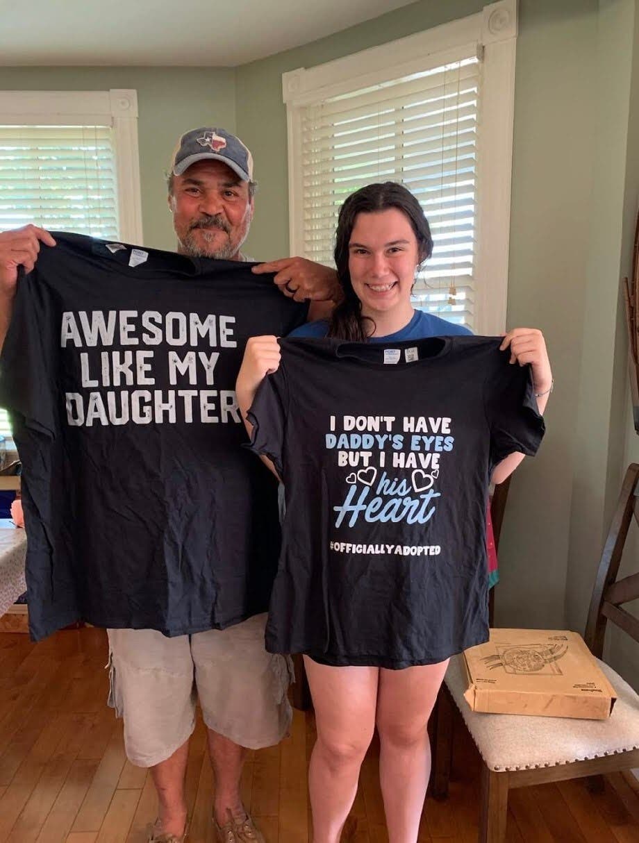 The father and daughter are holding shirts commemorating when Scott officially adopted Toni. That adoption came the day before Toni's 13th birthday.
