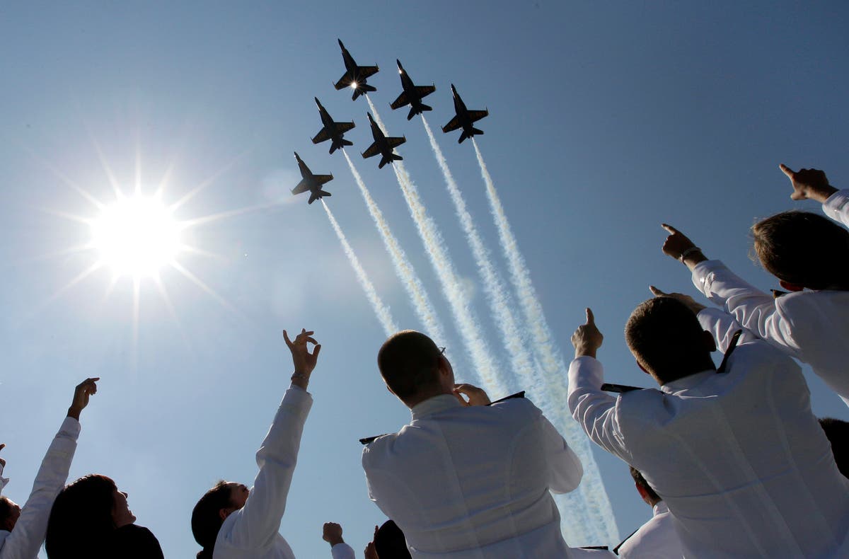 PHOTO: In a May 29, 2012 file photo, a formation of U.S. Navy Blue Angel fighter jets perform a flyover above graduating Midshipmen during the United States Naval Academy graduation and commissioning ceremonies in Annapolis. (AP Photo/Patrick Semansky, File)