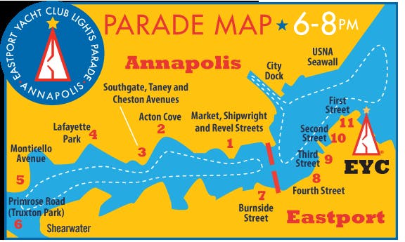 The Lights Parade will take place along the Annapolis Spa Creek waterfront, below and above the bridge. For information on access points, check out the Parade Map.