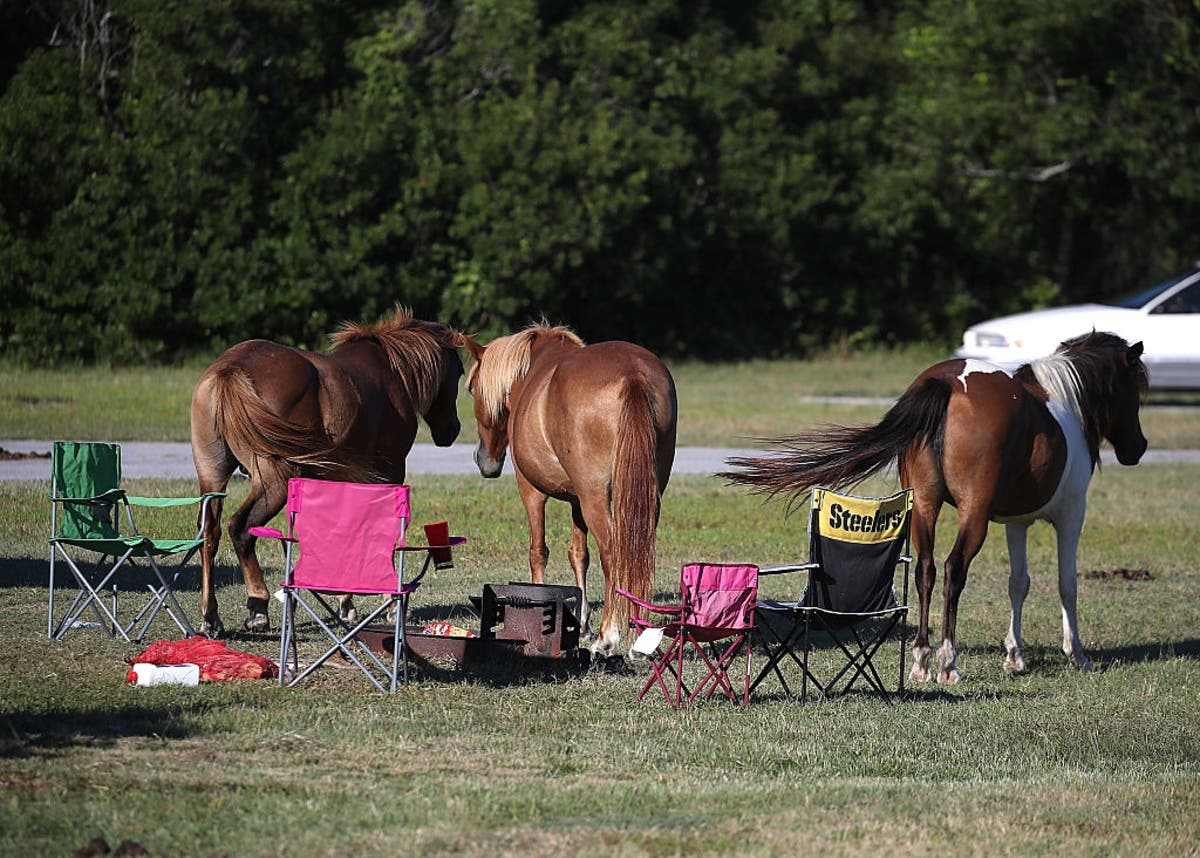 PHOTO: Wild ponies gather at a camp site on August 24, 2016 in Assateaque Island, Maryland. Assateaque Island National Seahore has a combined total of over 300 wild ponies between Maryland and Virginia, and are belived to have originlally came from a Spanish cargo ship that sank offshore in the 1600s. (Photo by Mark Wilson/Getty Images)
