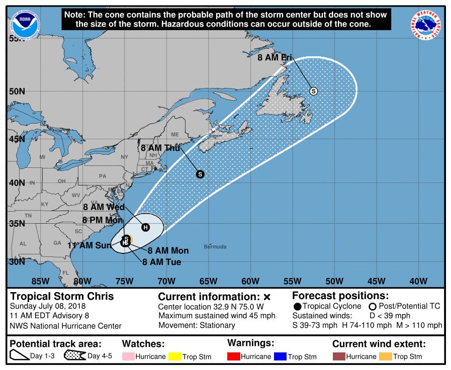 Swells generated by Chris are expected to increase and affect portions of the coasts of North Carolina and the mid-Atlantic states into early this week, the National Weather Service said Sunday. These swells could cause life-threatening surf and rip current conditions.