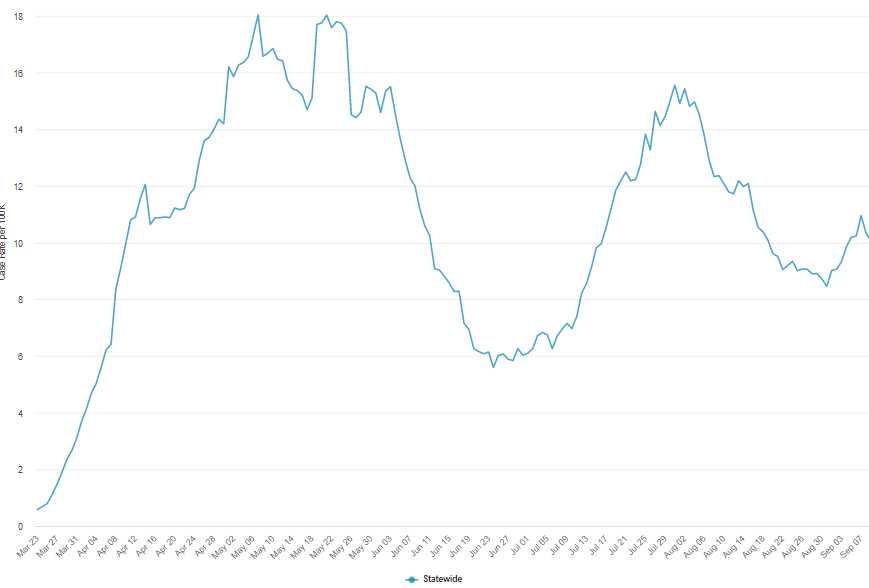 The state's positivity rate has seen an uptick since it bottomed out at 3.08 percent on Aug. 21. Now, the seven-day rolling average sits at 3.71 percent. The weekly positivity rate topped out at 26.88 percent on April 17.