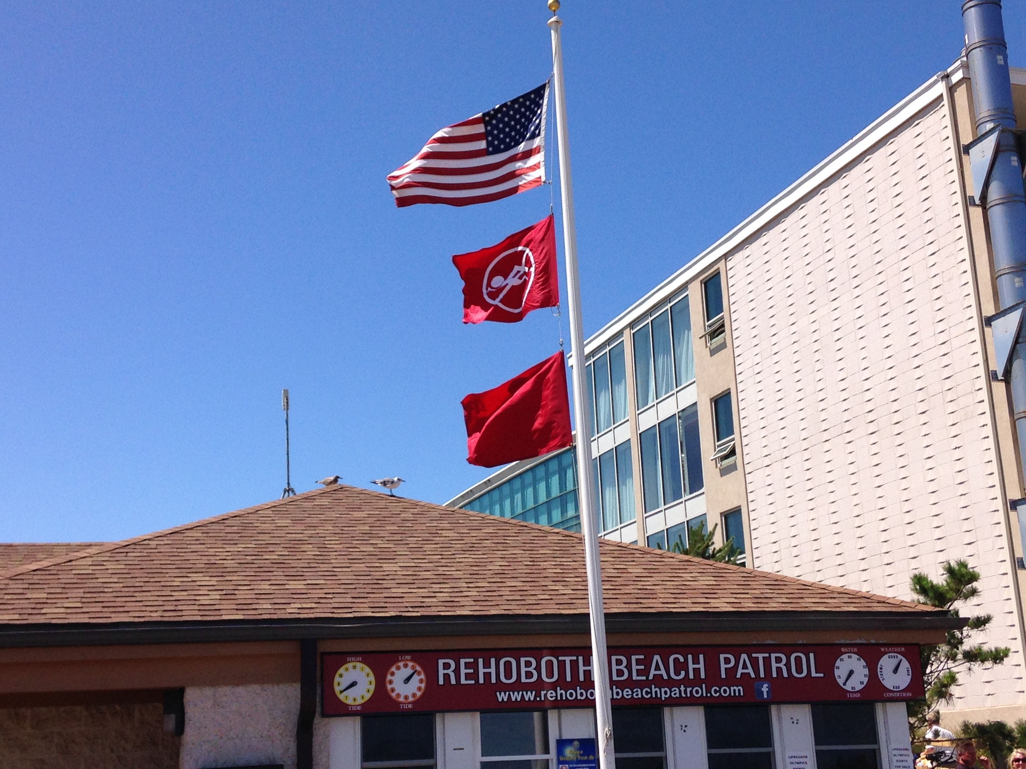 » A red flag flew over the boardwalk in Rehoboth Beach, DE, on Aug. 24, when swimming was prohibited due to rough conditions. Rip currents will be a danger this week as Tropical Storm Cristobal moves along the East Coast. Credit: Patch photo by Elizabeth Janney