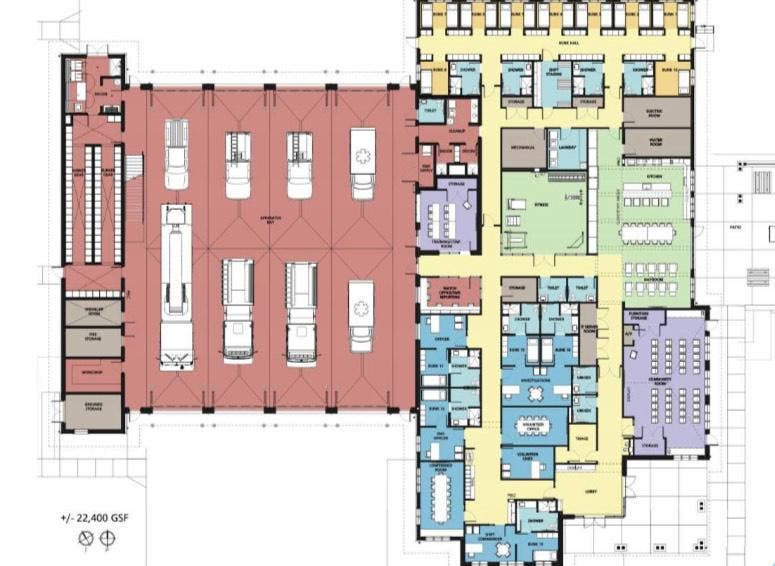 The firehouse will span 22,400 square feet and have four drive-through bays. There will also be a fitness room and a commercial kitchen.