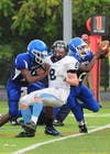 Annapolis quarterback Brandon Johnson ran a draw for a short gain and then pitched to Tajuan Watson who ran to the 30-yard line for a first down. Johnson spiked the ball to stop the clock with 15 seconds remaining. On what seemed likely to be the last play of the half, Johnson eluded the pass rush and threw a swing pass to Keith Collins who raced upfield untouched — only to be tackled at the 1-yard line with 1 second left.