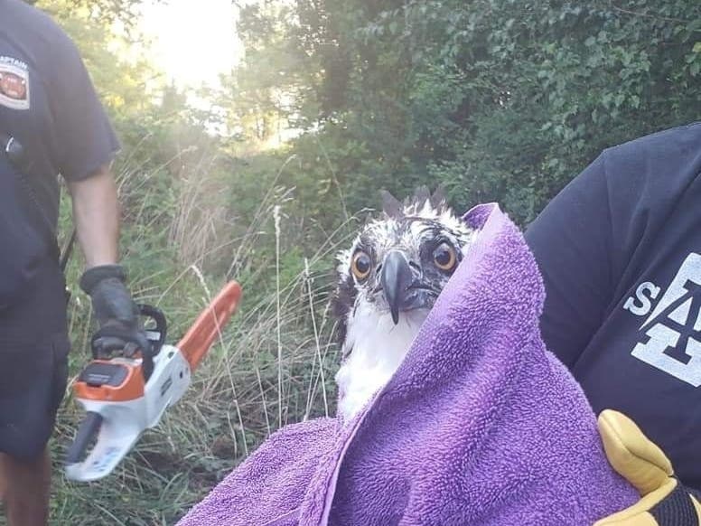 She asked the Fighting 46 for help and five firefighters with Rescue Engine 47 showed up with a chainsaw. It took two hours, but they eventually were able cut down the dead tree, angling it to where the tree would land on soft grass and keep the bird safe at the top of the tree. Once the young osprey was within arm's reach, McDonald moved in. It was being treated for wounds on its wings and left leg caused by the fishing line at Owl Moon Raptor Center, but sadly, the center announced that the bird succumbed to its injuries.