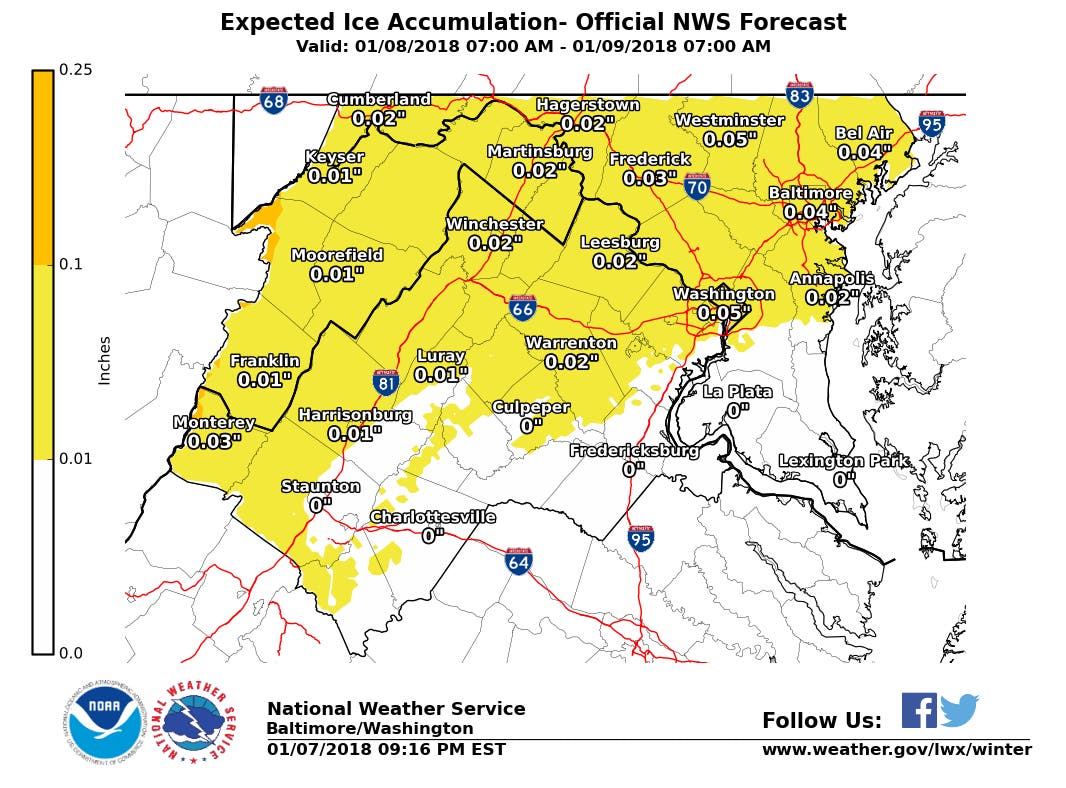 Areas south of Baltimore are under a separate winter weather advisory calling for the same freezing rain and icy conditions but during a different time frame, from 3 to 9 p.m. on Monday, Jan. 8: