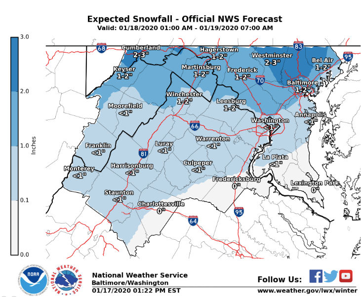 Frederick and Hagerstown are expected to get 2 inches of snow, while the Inner Harbor in Baltimore may see about an inch of accumulation, according to projections released Friday by the National Weather Service. The northern part of the state may see 1 to 2 inches of snow. (See the graphic below for snowfall projections across the state.)