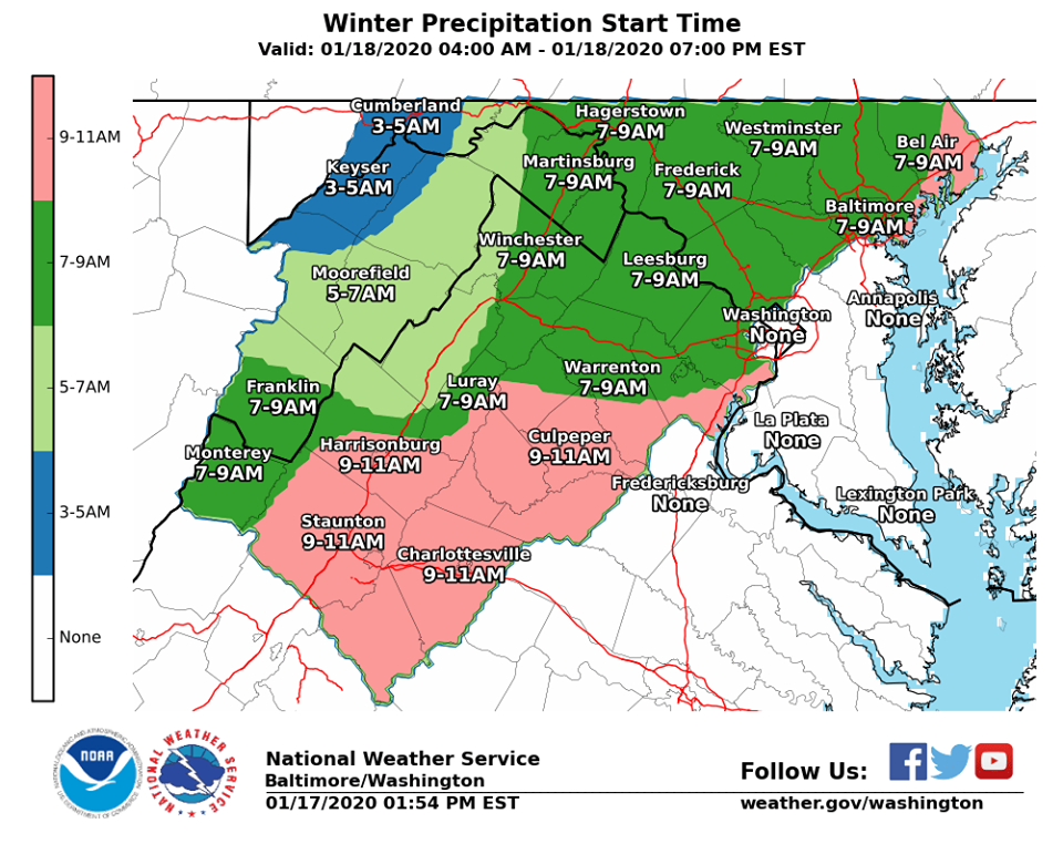 "Northwestern Virginia, eastern West Virginia and northern Maryland likely hang on to cold air longest, resulting in the highest (in a relative sense) accumulations over these areas, with light amounts to about the I-95/US-29 corridor," according to the forecast discussion. "Precipitation should end Saturday evening ... with some residual upslope snow showers lingering into Sunday. Otherwise, it will be cold and dry to end the weekend."