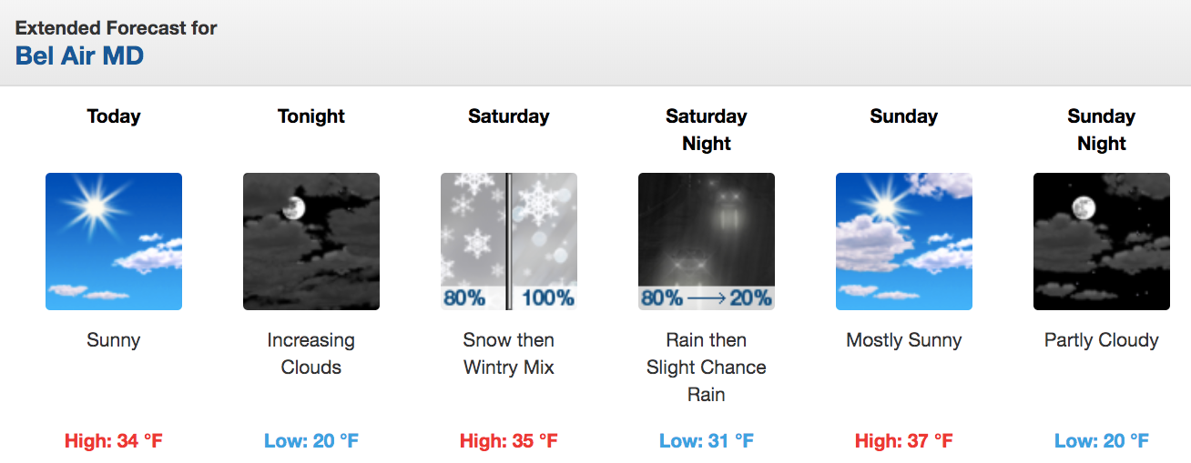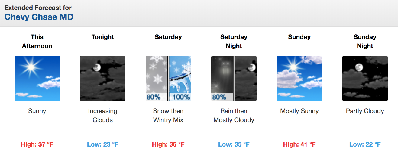 Here's the forecast for the Baltimore-Washington area from the National Weather Service:
