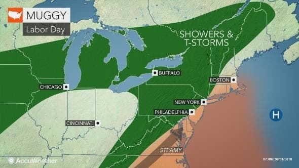 The storms throughout Labor Day weekend will be hit-or-miss in nature, soaking some communities but missing others just a few miles away, according to the weather site. Although Labor Day marks the unofficial end of summer, the season's heat and humidity may have some staying power for much of next week.