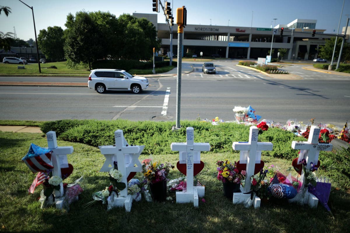 Photo: Five wood markers stand in a makeshift memorial outside the Annapolis Capital Gazette offices for the employees killed by a gunman last week July 2, 2018 in Annapolis, Maryland. The five victims were Gerald Fischman, 61, an editorial editor; Rob Hiaasen, 59, an editor and columnist; John McNamara, 56, a sports reporter and editor; Wendi Winters, 65, a news reporter and columnist; and Rebecca Smith, 34, a sales assistant. Police arrested Jarrod Ramos, 38, in the paper's newsroom and he is being held without bond on five counts of murder. (Photo by Chip Somodevilla/Getty Images)
