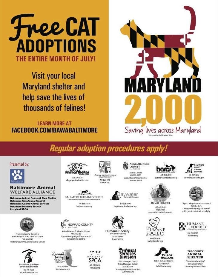 More than 2,000 cats and kittens across Maryland are are in need of homes. Through July 31, 20 adoption centers around Maryland are waiving adoption fees in an effort to find homes for these cats.