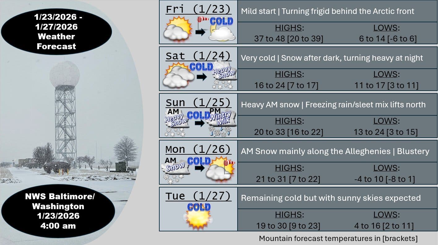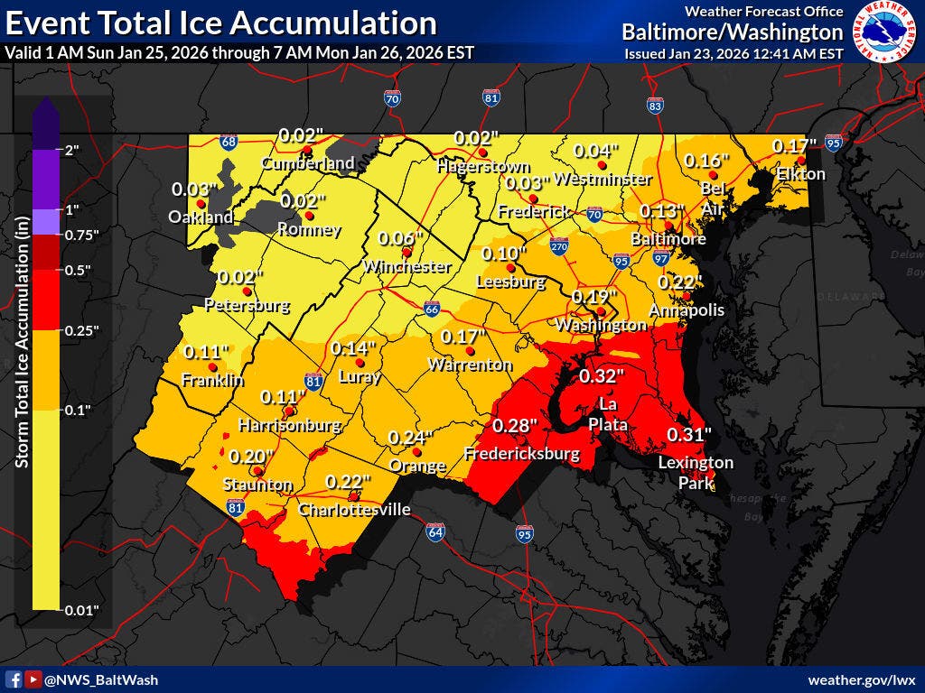 Here's what the agency said is coming to the Baltimore-DC region: "A large area of precipitation will overrun Arctic air in place over the Mid-Atlantic. This will likely lead to widespread significant snow beginning late Saturday, with the potential for ice Sunday, especially south of Highway 50 and near and east of Interstate 95.